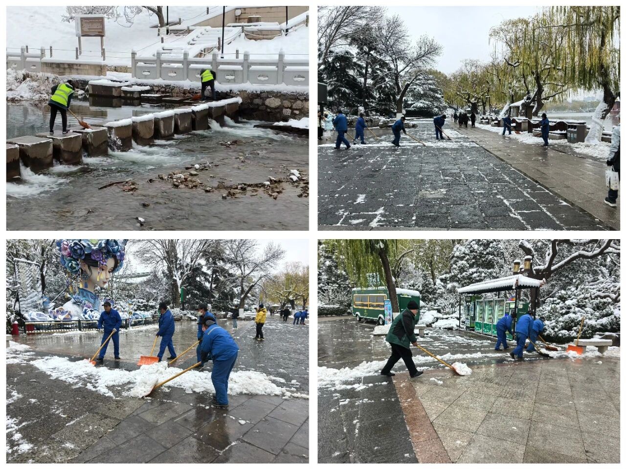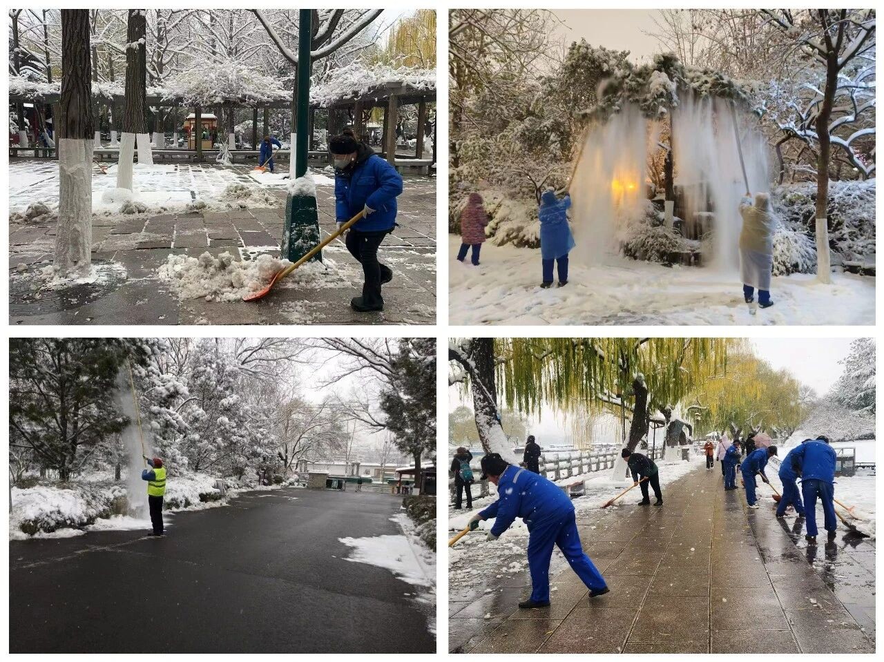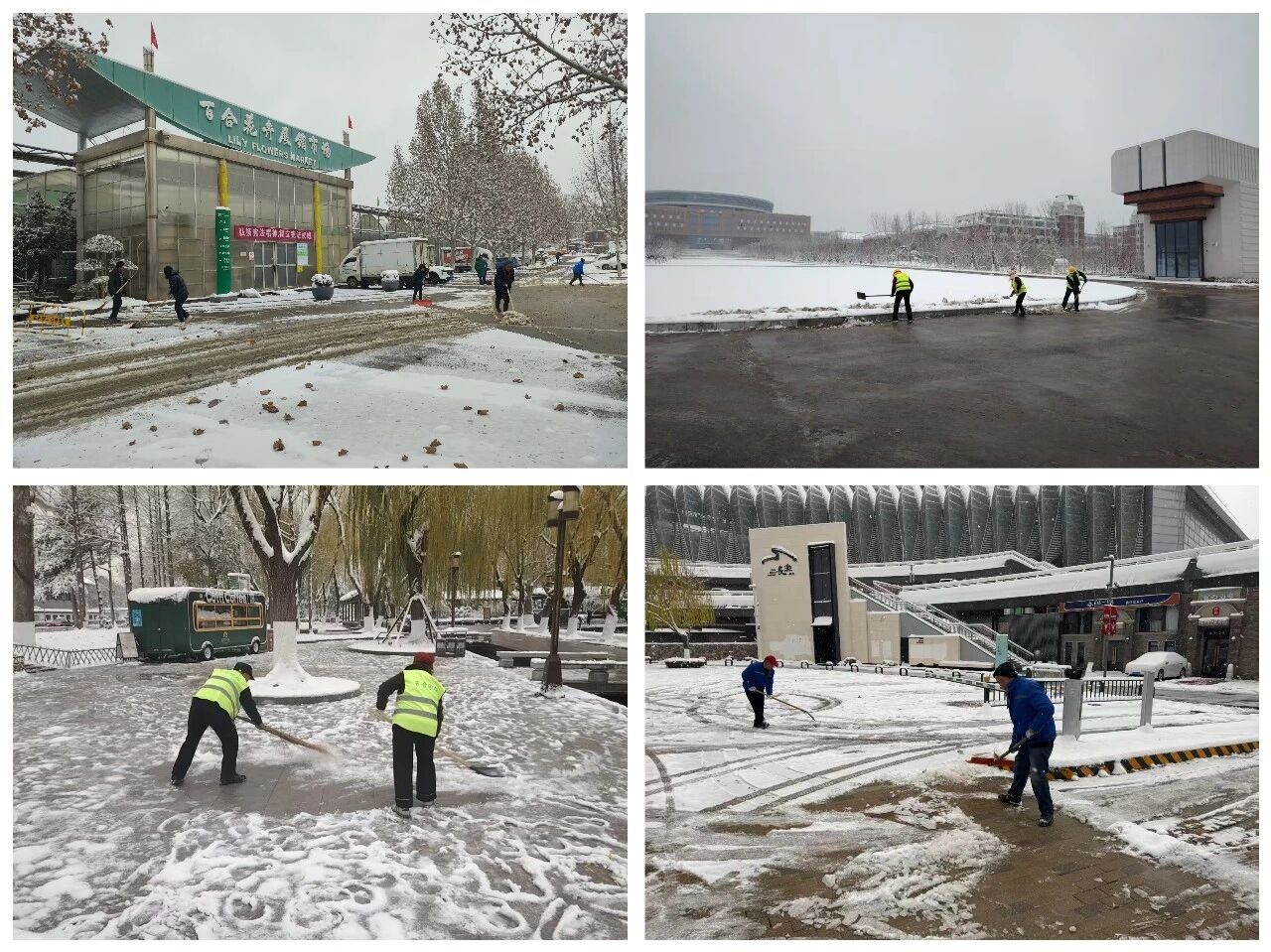 12月12日,初雪降臨。當(dāng)人們欣賞銀裝素裹的美景時(shí),百合園林的一線工作者已迎雪而動(dòng)。