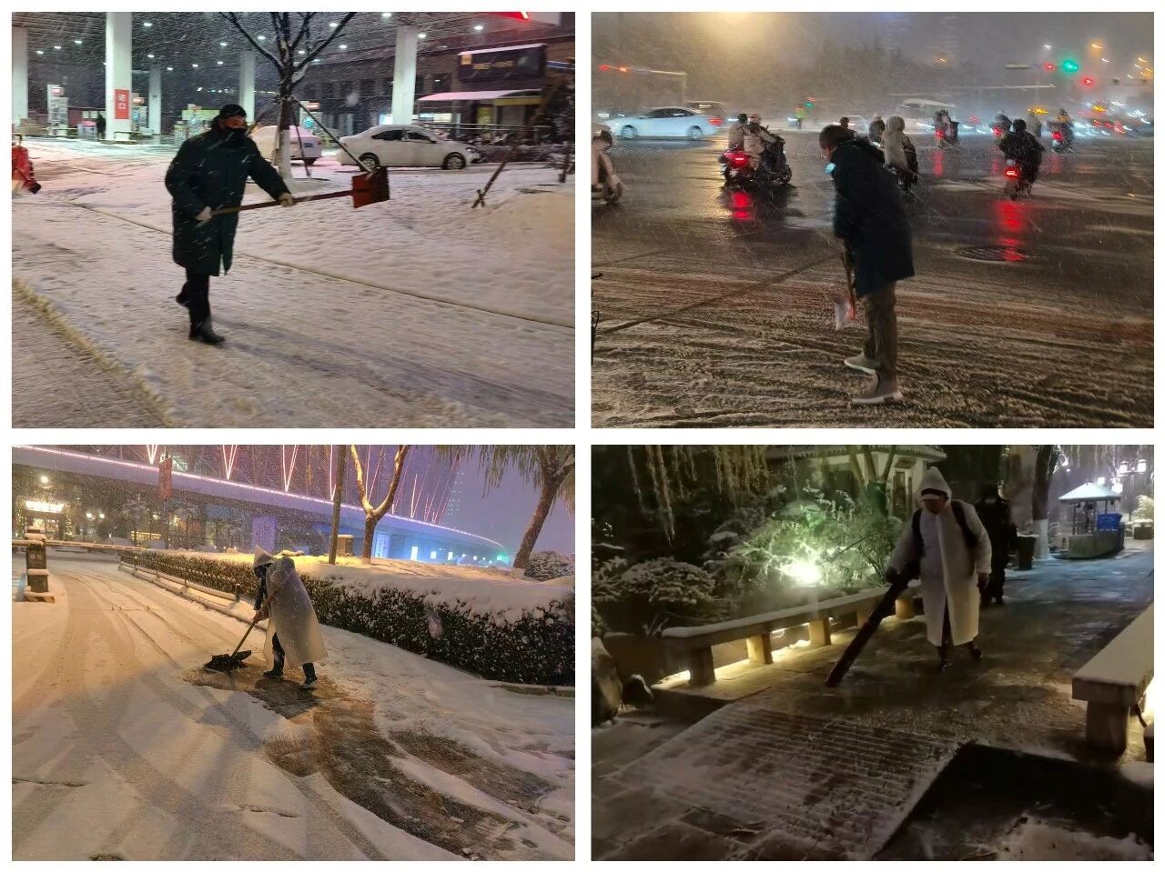 雪情即是命令。各一線部門聞雪值守,加強(qiáng)巡查。風(fēng)雪中,他們處置被積雪壓彎的樹枝,及時(shí)清理斷枝,消除安全隱患。為確保道路暢通,各片區(qū)人員迅速集結(jié),出動(dòng)人工400余人,掃雪機(jī)5臺(tái),清雪車2輛,清掃道路廣場(chǎng)10余萬平方,設(shè)置警示標(biāo)志200余處。全力清掃主干道、出入口及重點(diǎn)區(qū)域積雪,保障市民安全出行。