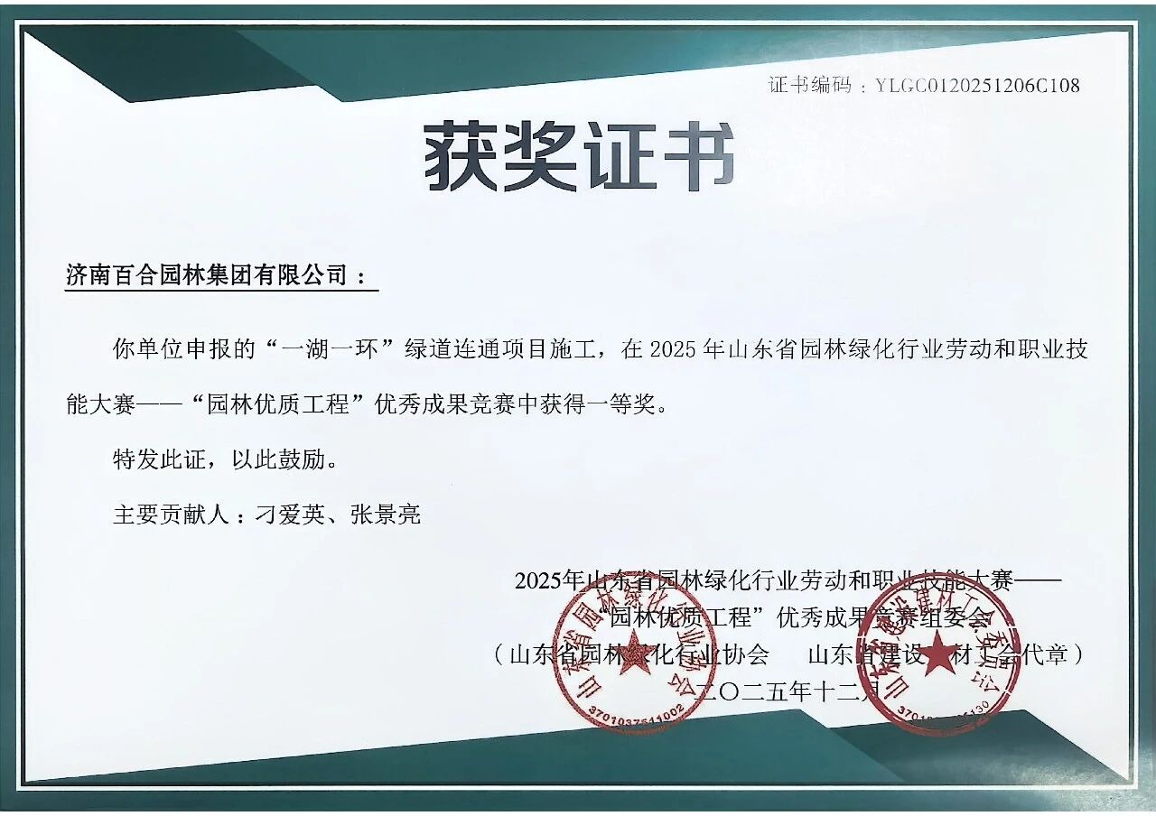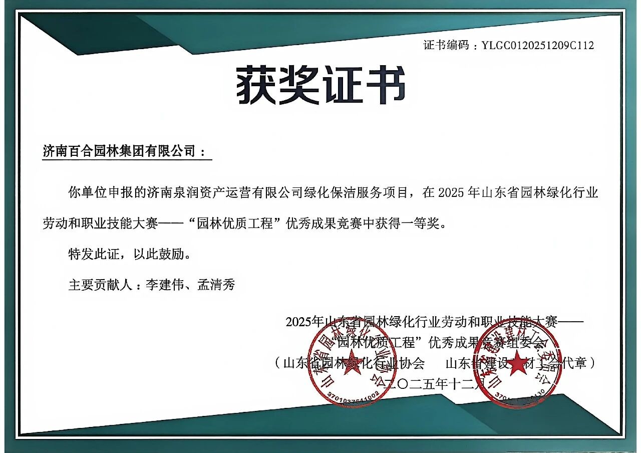 近日,2025年山東省園林綠化行業(yè)勞動(dòng)和職業(yè)技能大賽——“園林優(yōu)質(zhì)工程”優(yōu)秀成果競(jìng)賽活動(dòng)結(jié)果揭曉。濟(jì)南百合園林集團(tuán)有限公司憑借卓越的綜合實(shí)力與精湛的專業(yè)技藝榮獲多項(xiàng)榮譽(yù)。