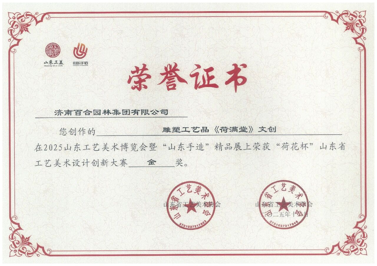 此次展會獲獎,既是行業(yè)對百合園林集團(tuán)藝術(shù)創(chuàng)作能力的權(quán)威肯定,更是對“山東手造” 文化傳承與創(chuàng)新實(shí)踐的有力推動。未來,百合園林集團(tuán)將繼續(xù)堅守匠心、深耕細(xì)作,在傳承傳統(tǒng)工藝美術(shù)精髓的基礎(chǔ)上不斷探索創(chuàng)新,以更多優(yōu)質(zhì)作品賦能文化產(chǎn)業(yè)發(fā)展,為推動 “山東手造” 走向更廣闊的舞臺貢獻(xiàn)百合力量!