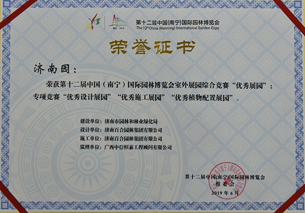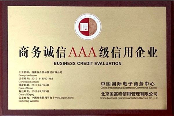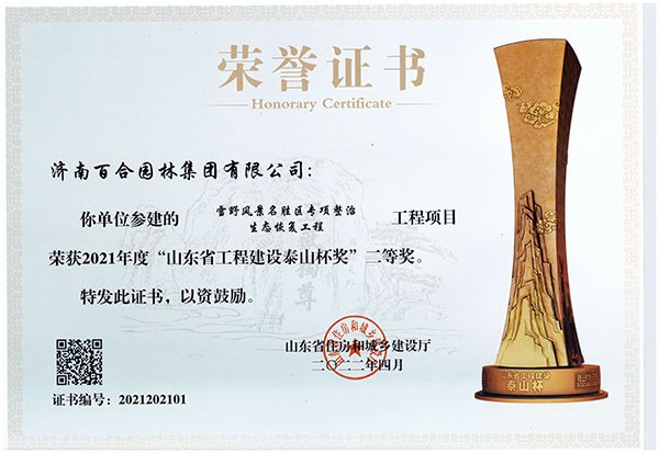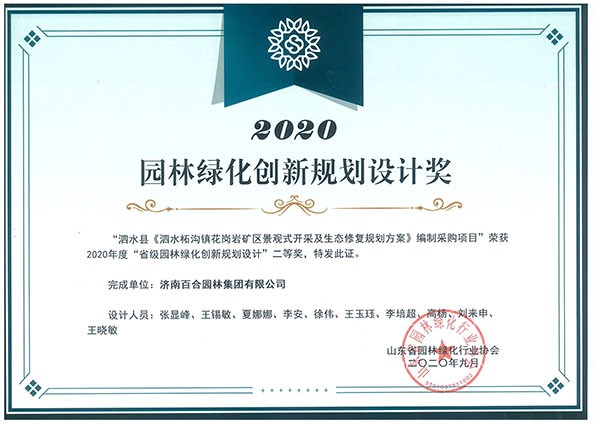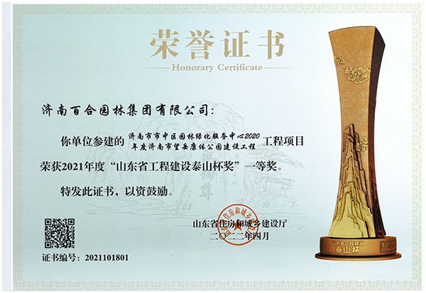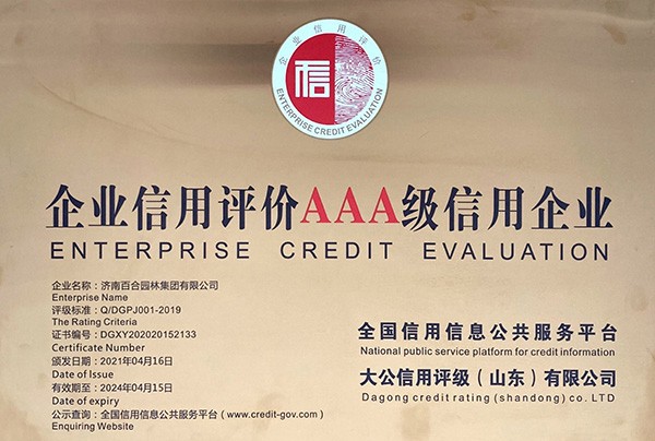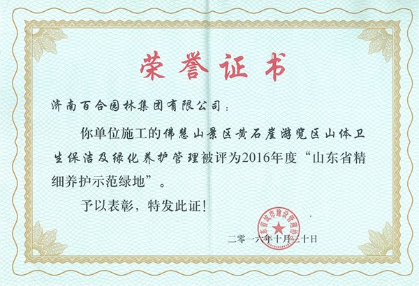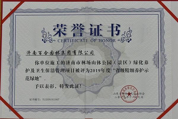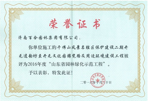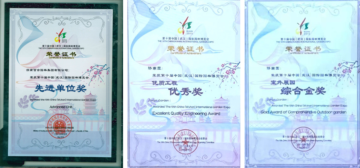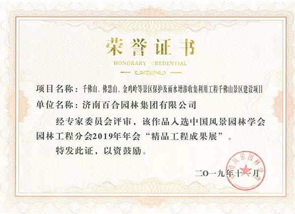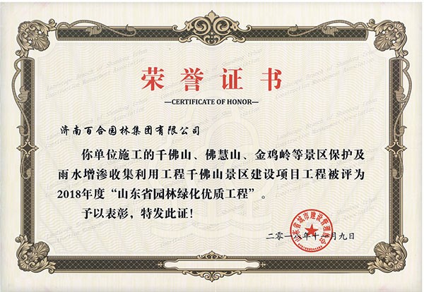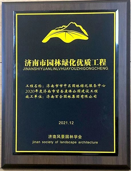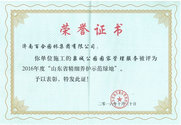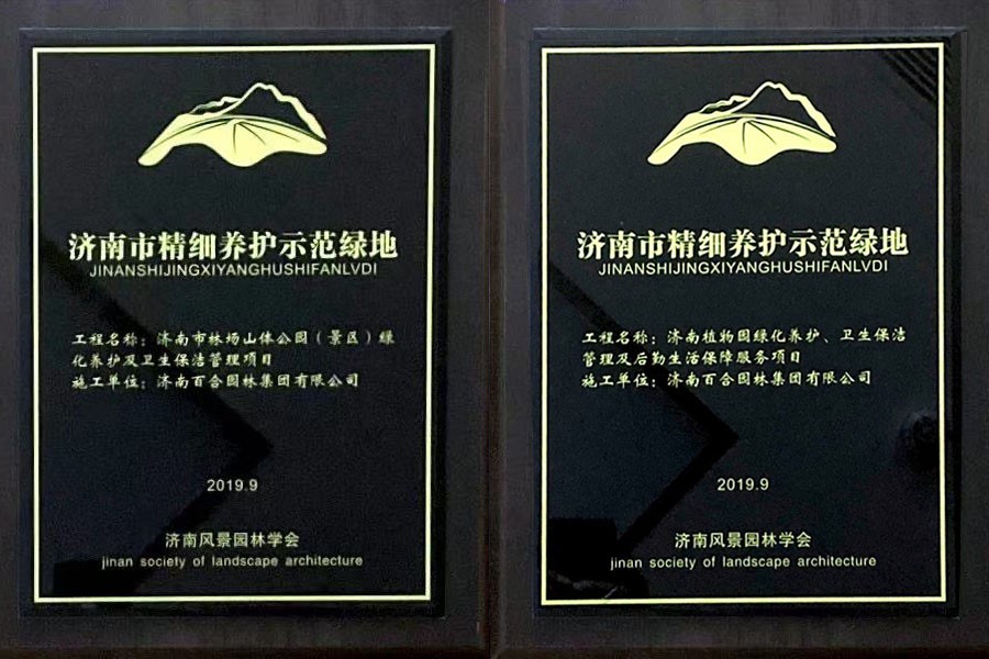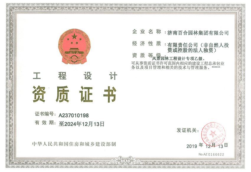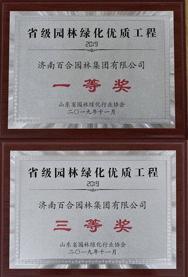 多年來,百合園林集團堅持“內(nèi)強素質(zhì),外塑形象”,以誠信求發(fā)展,擁有原國家園林綠化施工壹級資質(zhì)、風景園林設計乙級資質(zhì)、花卉苗木進出口經(jīng)營權(quán)、建筑和市政公用工程施工總承包叁級資質(zhì)、具備大型園林工程設計、施工和綠地養(yǎng)護管理能力。自成立以來,本著“建精品工程,樹百合形象”的宗旨,優(yōu)良的經(jīng)營業(yè)績、靈活的運行機制、過硬的技術力量、誠信的管理模式使百合園林集團被評為山東省“十大花卉企業(yè)”、山東省“種苗示范基地”,山東省“林木種苗先進單位”。施工的工程先后獲得“魯班獎”、中國風景園林學會優(yōu)秀園林綠化工程大金獎,省、市園林優(yōu)質(zhì)工程獎等多個獎項,設計項目獲得多項“艾景獎”、中國人居典范景觀設計方案金獎,省市優(yōu)秀設計獎等獎項。集團還先后獲得“五一勞動獎狀”,“中國風景園林學會3A級會員單位”等多項榮譽稱號。