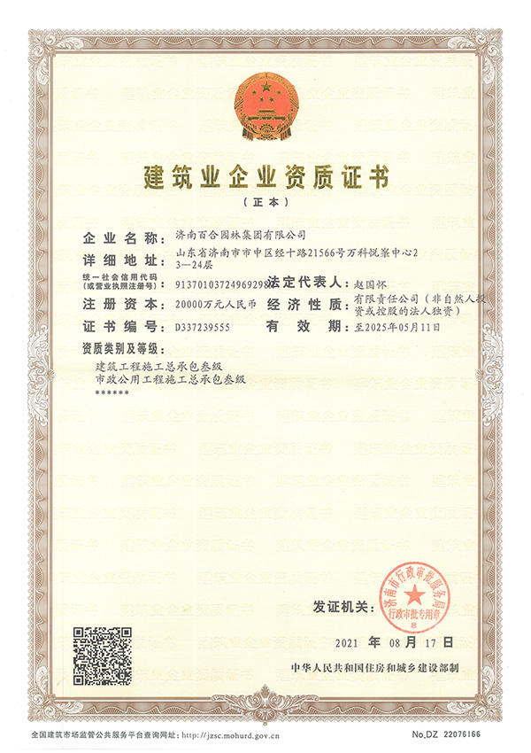 百合園林集團擁有國家園林綠化施工壹級資質(zhì)、市政公用工程施工叁級資質(zhì),具備大型園林工程設計、施工和綠地養(yǎng)護管理能力。