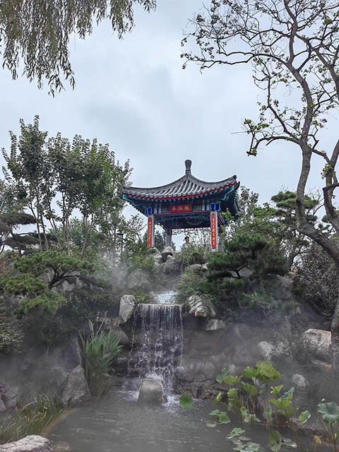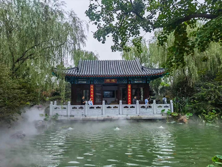 園內(nèi)分“濟(jì)南八景”“方言空間”“泉巷人家”“濼源水榭”“鵲華秋色”“登高觀瀾”六大板塊,以泉為載體,巧妙利用地形塑造、景觀構(gòu)筑、水體及園林元素,疊山理水、亭廊軒榭,配以花木,曲徑通幽,因地制宜建設(shè)成為一個極富有層次感的展園,形成集錦式園林景觀。