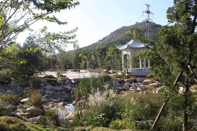 工程在建設(shè)過程中,以“自然、生態(tài)、休閑、和諧”為指導(dǎo)思想,在繼承和保護(hù)原有景觀資源的基礎(chǔ)上,完善和豐富景區(qū)的功能和景觀內(nèi)容,新增游覽道路、休息平臺(tái)、活動(dòng)空間、停車場、廣場、園林小品及服務(wù)建筑等,并根據(jù)景區(qū)規(guī)劃定位對(duì)景區(qū)進(jìn)行綠化。