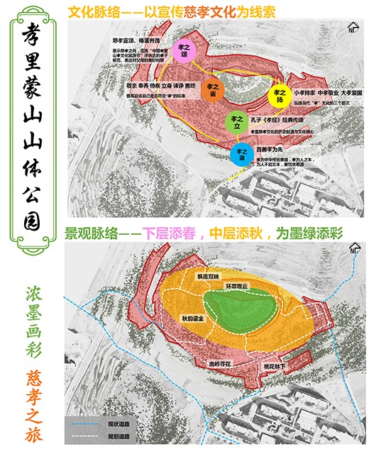 從“一個(gè)功能復(fù)合的社區(qū)公園、一個(gè)植被多樣的生態(tài)公園和一個(gè)底蘊(yùn)豐厚的文化公園 ”三個(gè)方面入手,致力于將設(shè)計(jì)場(chǎng)地打造為一個(gè)突出人文關(guān)懷、自然感知、文化韻味的開(kāi)放式、體驗(yàn)式山體公園。