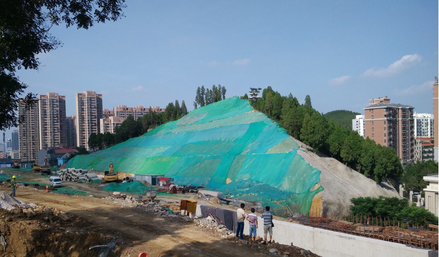 翠屏山工程邊坡位于濟(jì)南市二環(huán)東路沿線,千佛山風(fēng)景名勝區(qū)西臨,對(duì)重要道路地段的景觀有較大影響,同時(shí)也承擔(dān)了破損山體生態(tài)功能的需求。坡面為建設(shè)老虎山隧道,因隧道施工而形成的人工坡面,長137米,高29米,坡度39.6°,綠化面積3552平方米。原地形為三級(jí)平臺(tái),每級(jí)平臺(tái)寬約2米,由于雨水侵蝕,有部分土石滑落的現(xiàn)象。項(xiàng)目在坡面排險(xiǎn)的基礎(chǔ)上,采用生態(tài)袋、土工格室、植被毯等多修復(fù)方式結(jié)合的方法,選擇適宜的植物,對(duì)坡面進(jìn)行植被重建,最終修復(fù)成一個(gè)集穩(wěn)固邊坡、生態(tài)修復(fù)、保持水土、景觀綠化等多功能為一體的綜合性邊坡,呈現(xiàn)出具有自然性和生態(tài)性的綠化景觀。