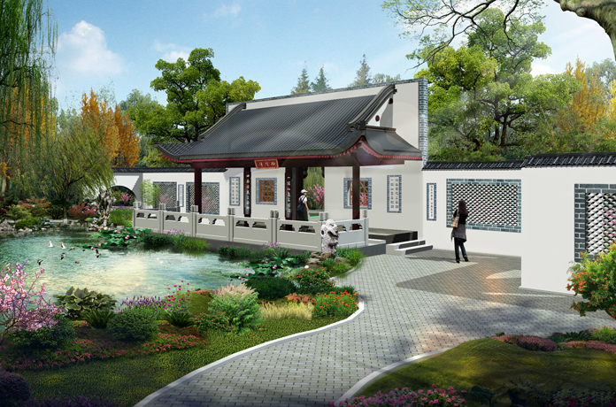 園區(qū)共設(shè)置新泉新韻、騰蛟起鳳景門、疊石清泉、清泉石澗、綠影清韻廣場、芙蕖臺、泉韻詩情景墻、荷苑清廊、泉城印象等景點,通過曲折的園路及水系連接起來。以清波榭為主的一組臨水建筑是園區(qū)的主景,形成“碧水成鏡映詩情,綠柳如絲添畫意”的詩畫意境。
